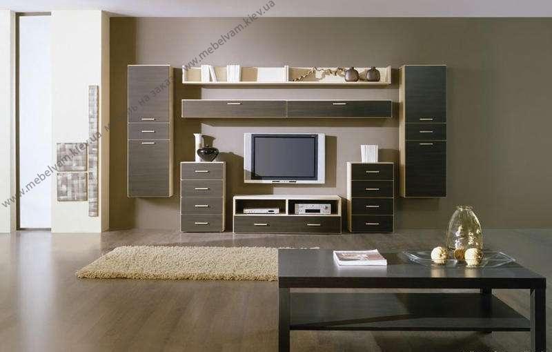 Модульная мебельная горка, состоит из модульных элементов: тв тумба, комоды, навесные полки и пеналы. Материал: Корпус - ДСП Дуб Венге светлый, Фасады - ДСП Дуб Венге темный.