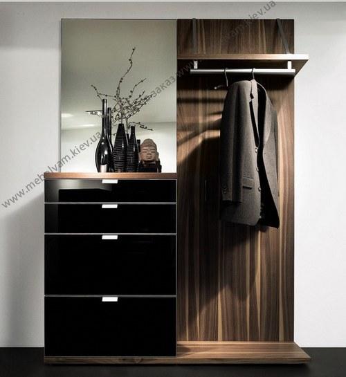 Небольшая современная прихожая на заказ. Тумба для обуви с выдвижными ящиками, зеркало и вешалка. Материал: ДСП EGGER F 901 Артвуд коричневый ST9; Фасады - МДФ Global Черный GL TRB 13 в алюминиевом профиле