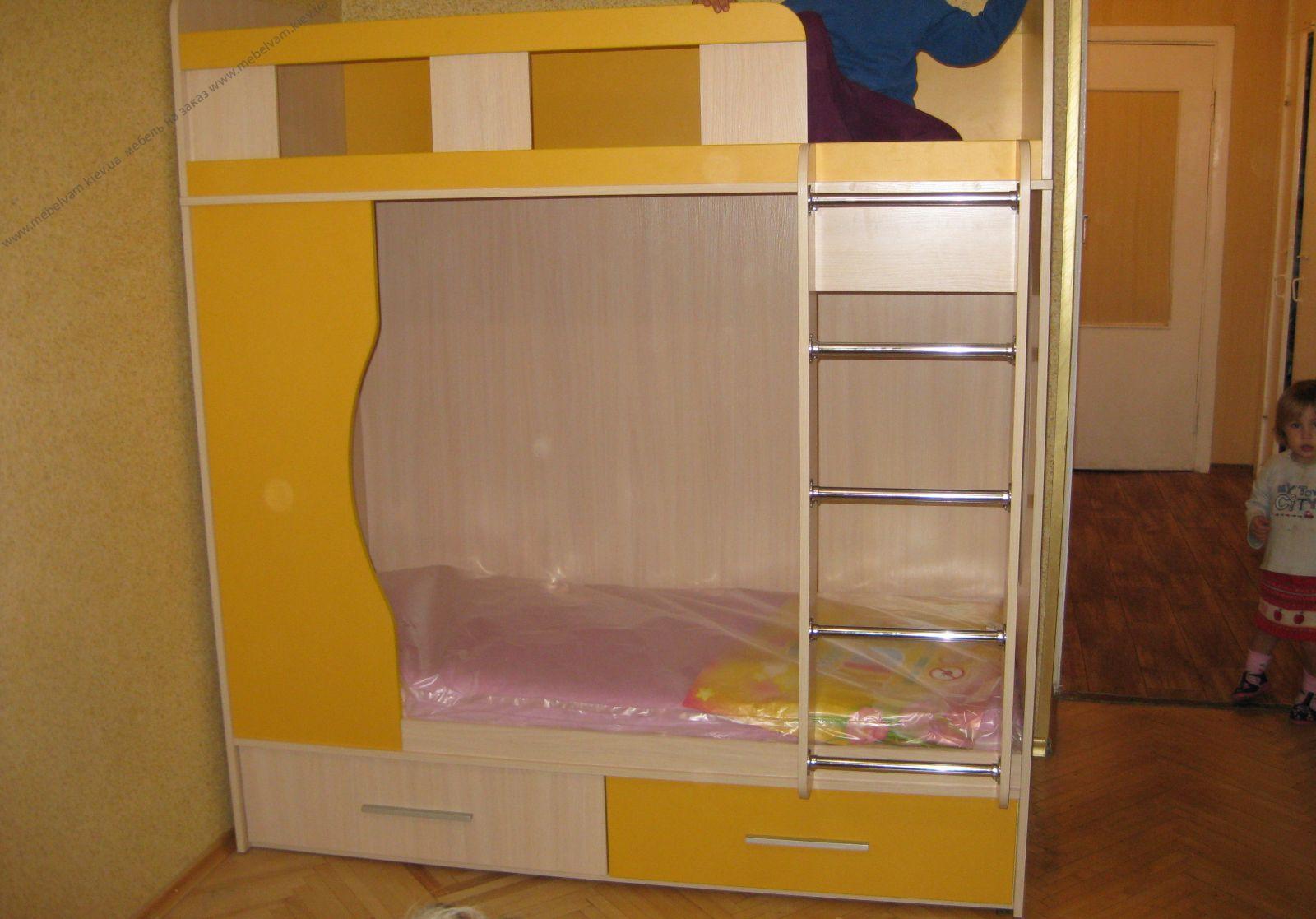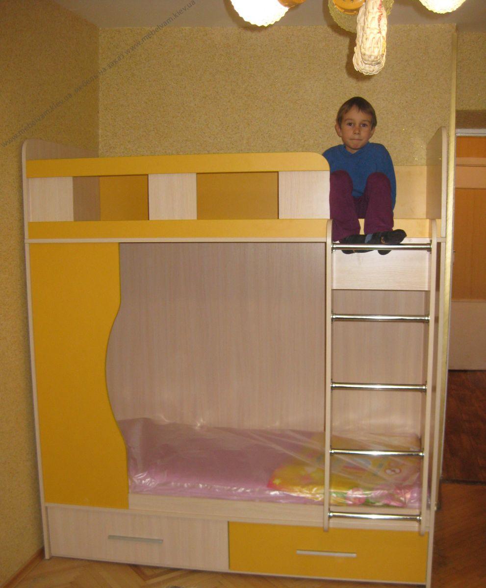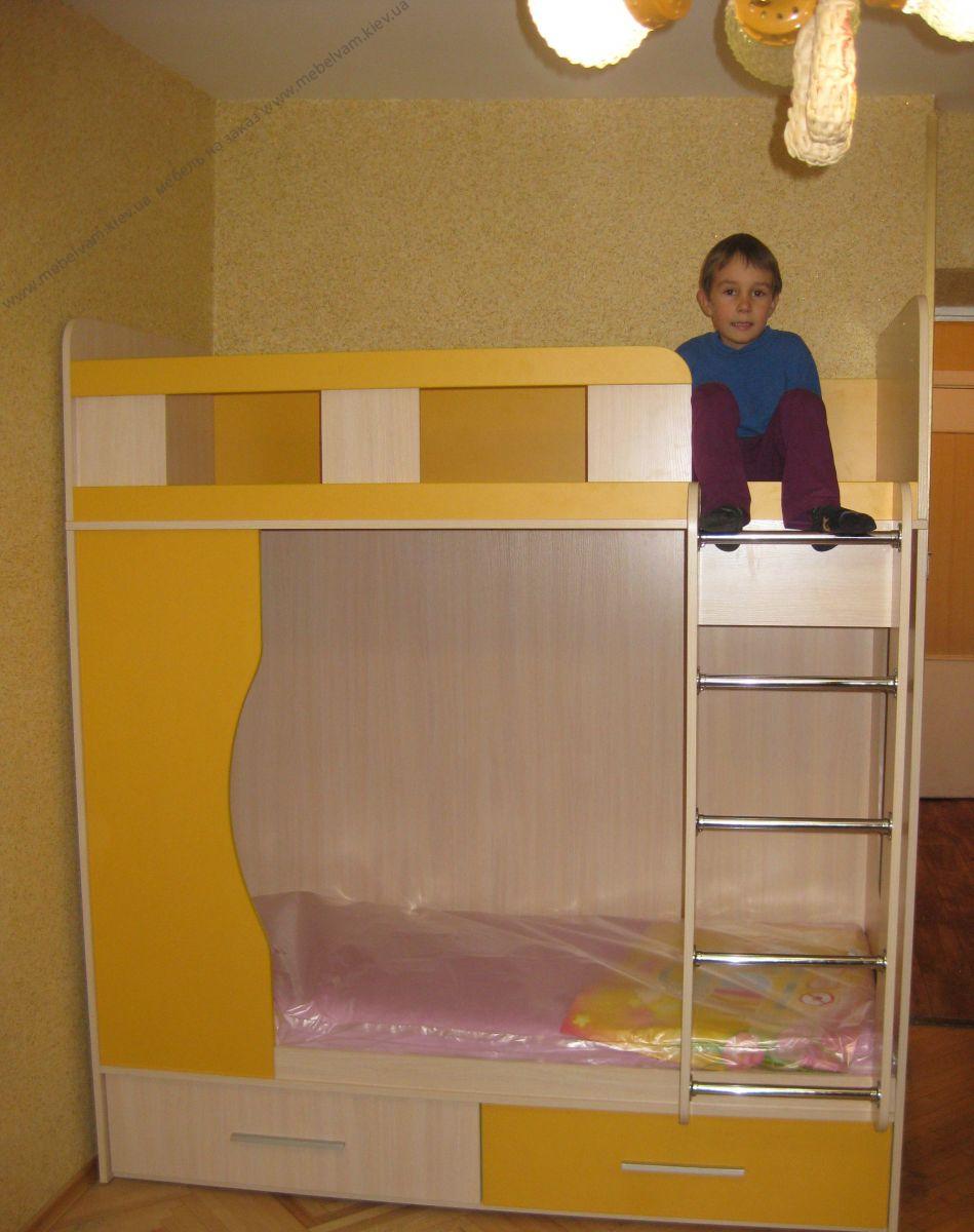 Кровать двухъярусная с боковым фигурным бортиком и навесной лесенкой. Материал: Корпус - ДСП Kronospan 8622 Дуб молочный ES; Фасады - ДСП Kronospan 0134 Желтый РЕ.