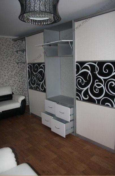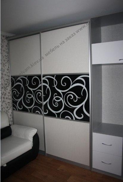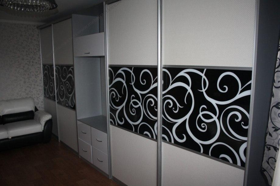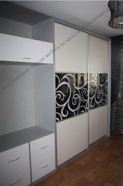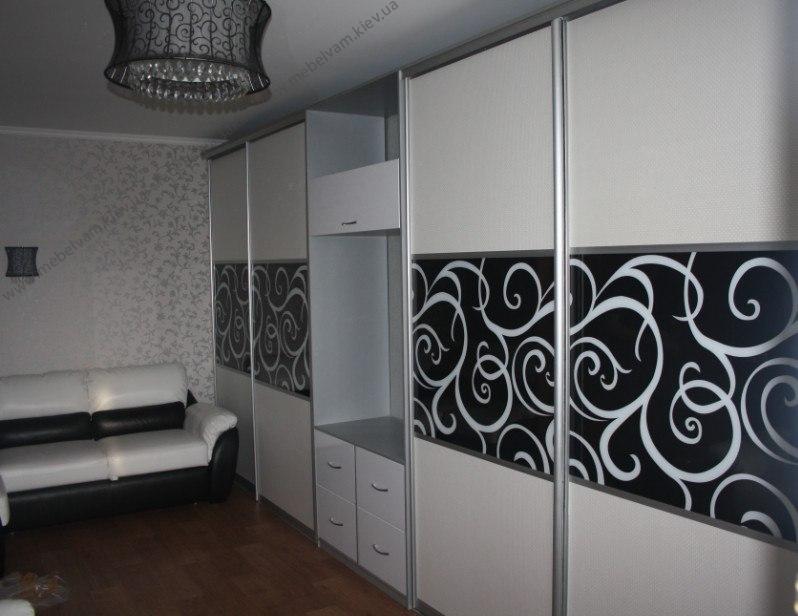 Мебельная стенка в гостиную, состоящая из двух шкафов купе, комода и навесного шкафчика, которые располагаются между шкафами купе. Материалы: Корпус - ДСП Kronospan UA 0881 Алюминий РЕ; Фасады - ДСП Kronospan UA 0101 Белый фасадный BS, Фотопечать на стекле; Система STARKE - Профиль открытый, цвет Алюминий.
