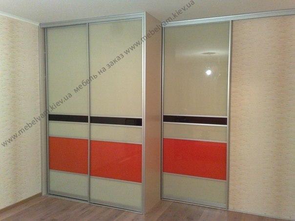 Шкаф купе и межкомнатная дверь в едином стиле и одинаковых материалах. Материалы: ДСП Kronospan 2427 Венге светлый PR; Фасады - Стекло крашенное RAL 8017 Коричневый шоколад, RAL 2004 Чистый оранжевый, RAL 1015 Легкий слоновый; Система STARKE - Профиль открытый, цвет Алюминий.