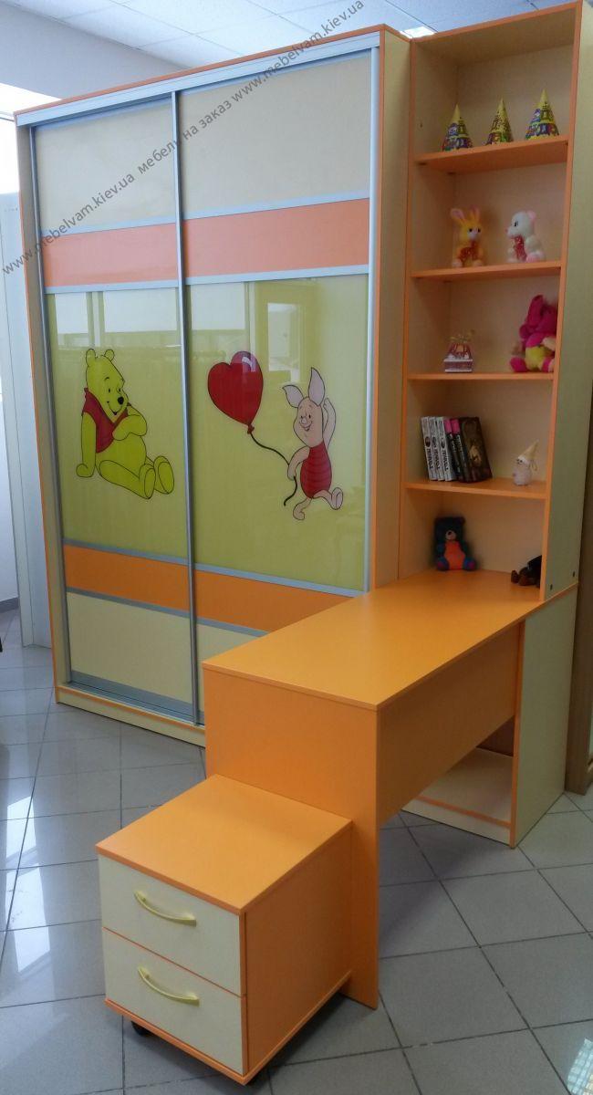 Детский шкаф-купе с комбинированными фасадами, фотопечать, ДСП, стекло крашенное. Оранжевая кромка ПВХ смотрится контрастно на светлом ДСП. Материалы: ДСП Kronospan 0515 Песочный BS; Фасады - Фотопечать, Стекло крашенное, ДСП; Система STARKE - Профиль открытый, цвет Алюминий.