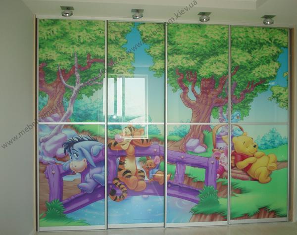 Двери-купе для детской комнаты с фотопечатью. Материалы: Фасады - Фотопечать на стекле; Система STARKE - Профиль открытый, цвет Алюминий.