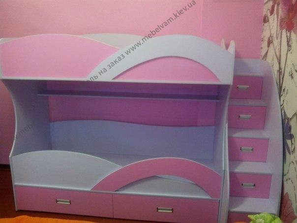 Двухъярусная кровать для девочек. Оригинальные фигурные защитные бортики. Материалы: Корпус - ДСП Kronospan 0110 Белый Корпусный PE; Фасады – ДСП Kronospan 8534 Роза BS.