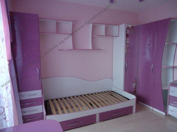 Детская комната для девочки. Комплект мебели состоит из: пенала, кровати, навесных полок, оригинального углового шкафа с фигурными открытыми полками. Материалы: Корпус - ДСП Kronospan 0110 Белый Корпусный PE; Фасады – МДФ "Полифасад" Сирень глянец 201-HGP, Белый глянец OS1008-106.
