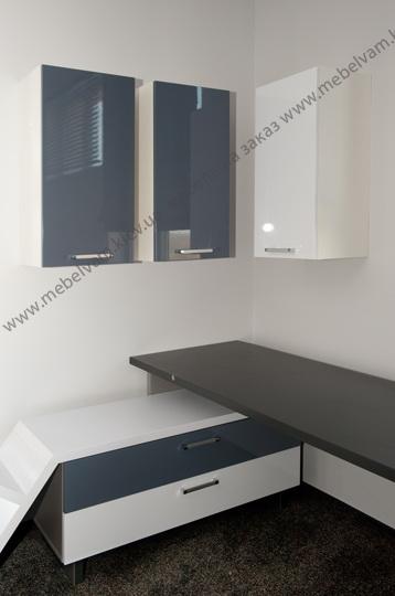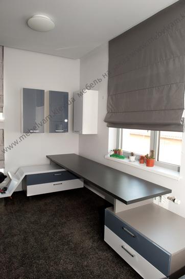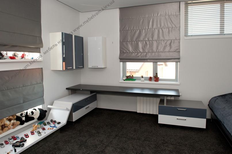Современная детская мебель в стиле хай-тек. Большой удобный рабочий стол, тумбы с выдвижными ящиками, навесные шкафчики. Материалы: Корпус - ДСП Kronospan 0110 Белый Корпусный PE, 0162 Серый Графит РЕ; Фасады – МДФ ВДМ Белый глян MCM 0019003G, МДФ крашенный RAL 7024.