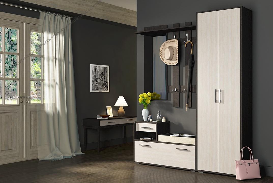 Современная прихожая на заказ: одежный шкаф, обувная тумба-скамейка, навесное зеркало с планками с крючками. Материал: ДСП Kronospan 8622 Дуб молочный ES, 2226 Венге магия ES.