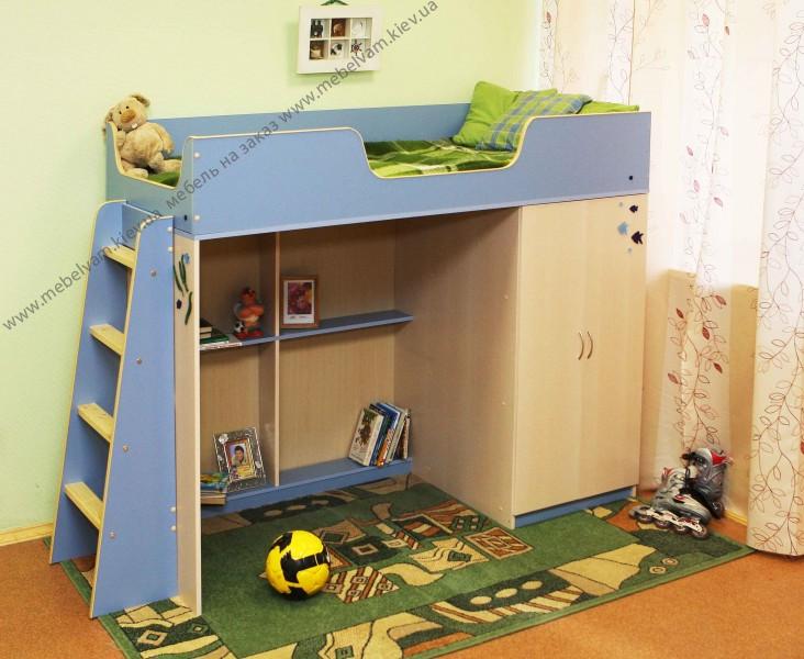 Небольшого размера кровать-чердак с платяным шкафчиком и полочками для игрушек. Кровать выполнена в двух цветах ламинированного ДСП. Красивый фигурный бортик на кровати. Материал: Корпус - ДСП; Фасады - ДСП.