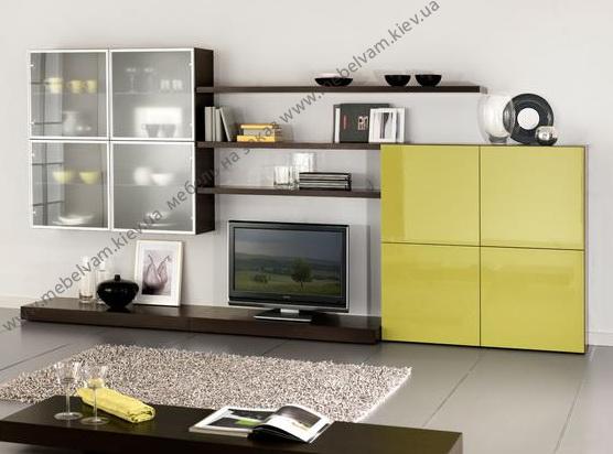В интерьере современной гостиной, стенка в стиле Хай-тек с оригинальными фасадами МДФ Лимон, будет выглядеть очень стильно. Материал: Корпус - ДСП Дуб Венге темный; Фасады - МДФ Лимон, Стекло Сатин белый в алюминиевой рамке.