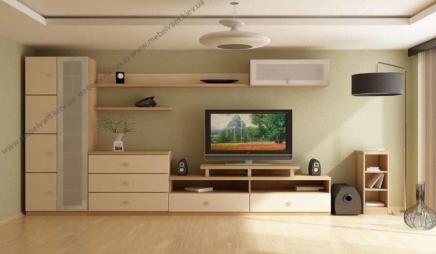 Вместительная стенка в гостиную в светлых материалах. Материал: Корпус - ДСП Дуб Венге светлый; Фасады - ДСП Ваниль, Стекло Сатин белый в алюминиевой рамке.