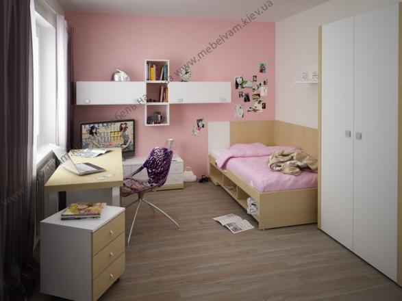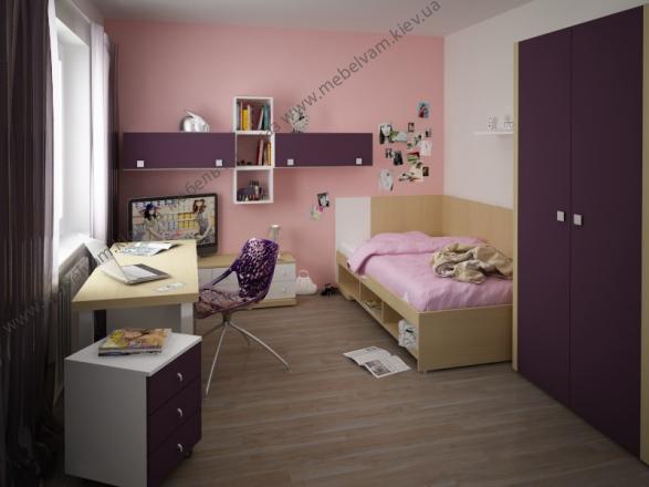 Современная комната подростка оборудована современной удобной корпусной мебелью: шкаф, кровать, тумба, полки,стол с тумбой. Материалы: Корпус - ДСП Дуб Венге светлый; Фасады – ДСП EGGER U 330 Баклажан ST15